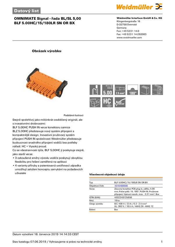 Weidmüller 1016480000 Obudowa złącza pin żeńskiego na kabel BLF 5.00HC/15/180LR SN OR BX, wire-to-board, piny: 15, 18.5