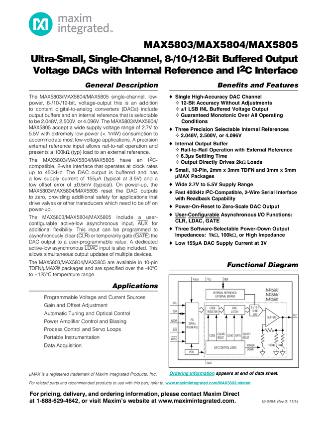 MAX5803 Ultra-Small, Single-Channel, 8-/10-/12-Bit Buffered Output Voltage DACs wit...