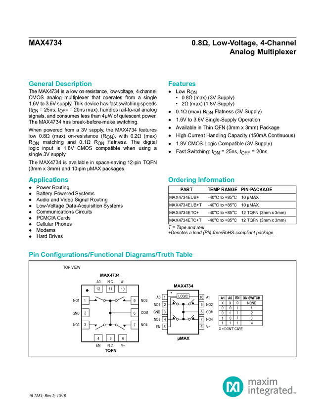 MAX4734 0.8Ω, Low-Voltage, 4-Channel Analog Multiplexer
