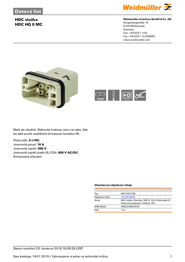 1919970000 Weidmüller HDC HQ 8 MC 1919970000 Wstawka pinowa męska 1 szt.