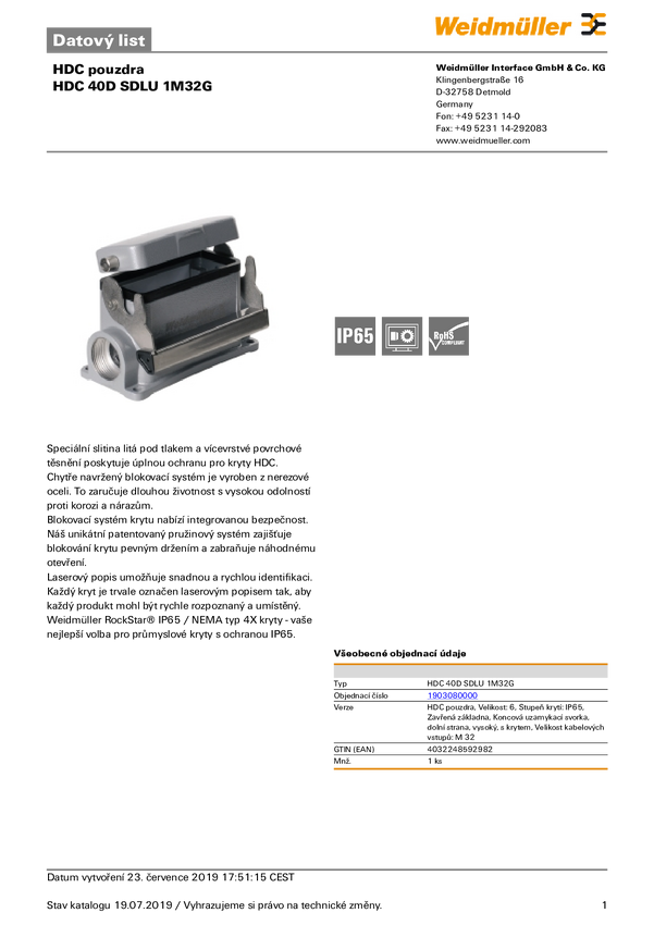 1903080000 Weidmüller HDC 40D SDLU 1M32G 1903080000 Obudowa podstawowa 1 szt.
