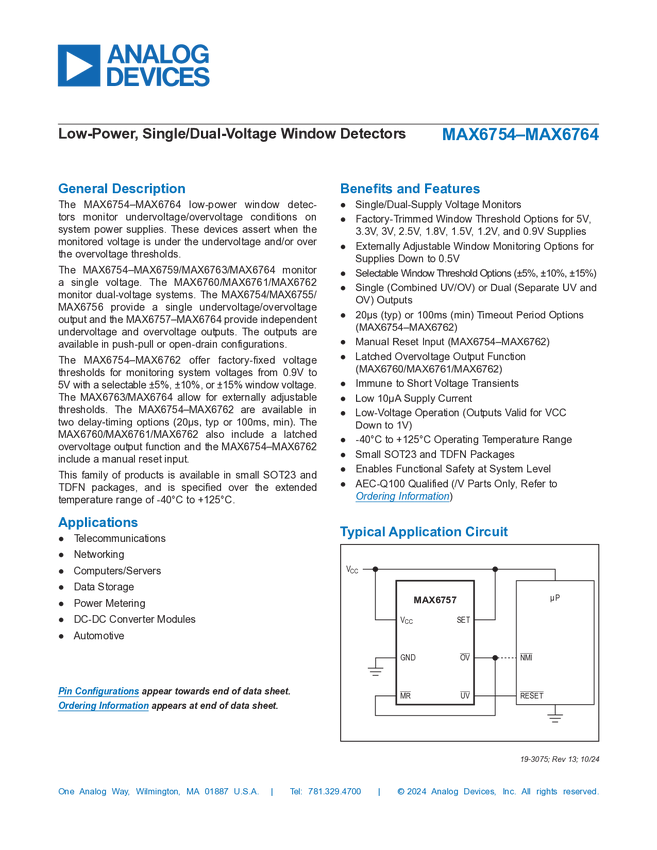 MAX6754 Low-Power, Single/Dual-Voltage Window Detectors
