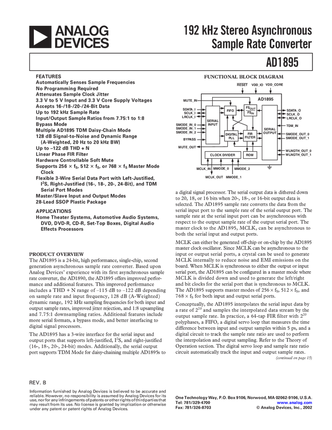 AD1895 192 HZ Stereo Asynchronous Sample Rate Converter