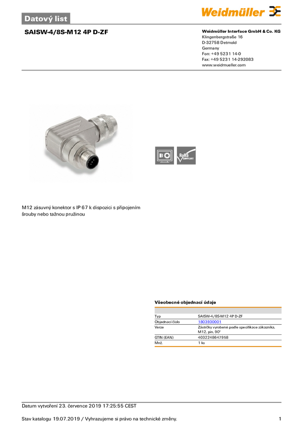 1803930001 Złącze czujników/elementów wykonawczych Weidmüller SAISW-4/8S-M12 4...