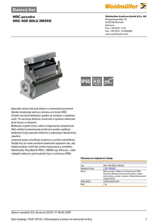 1787180000 Weidmüller HDC 40D SDLU 2M25G 1787180000 Obudowa podstawowa 1 szt.
