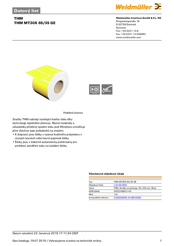 Oznacznik urządzeń, Etykieta, 65 x 35 mm, powłoka poliestrowa, Kolor: żółty Ilość znaczników: 1000 THM MT30X 65/35 GE/M