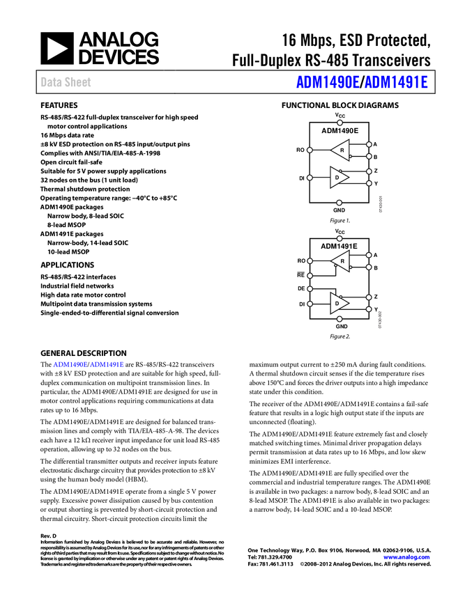 ADM1491E 5 V, 16 M, ESD Protected, Full-Duplex RS-485 Transceiver
