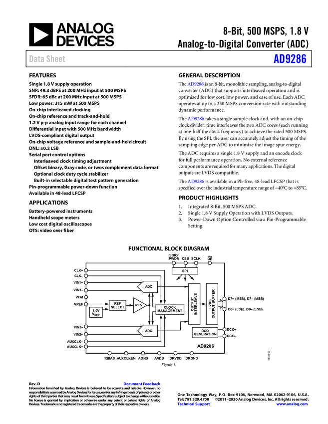 AD9286 8-Bit, 500 MSPS, 1.8 V Analog-to-Digital Converter (ADC)