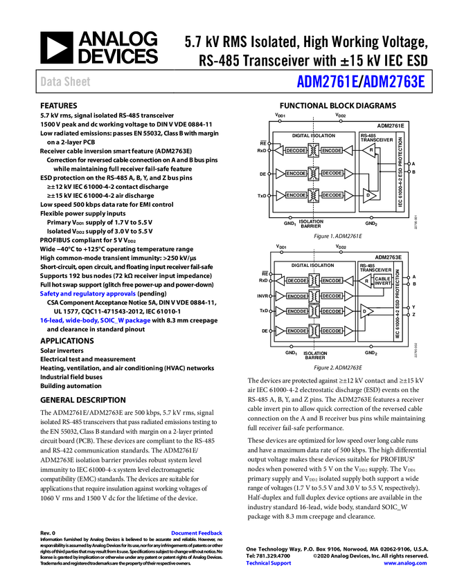 ADM2761E 5.7 kV RMS Isolated, High Working Voltage, RS-485 Transceiver with ±15 kV I...