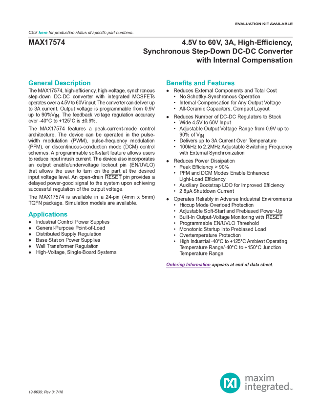 MAX17574 4.5V–60V, 3A, High-Efficiency, Synchronous Step-Down DC-DC Converter with I...