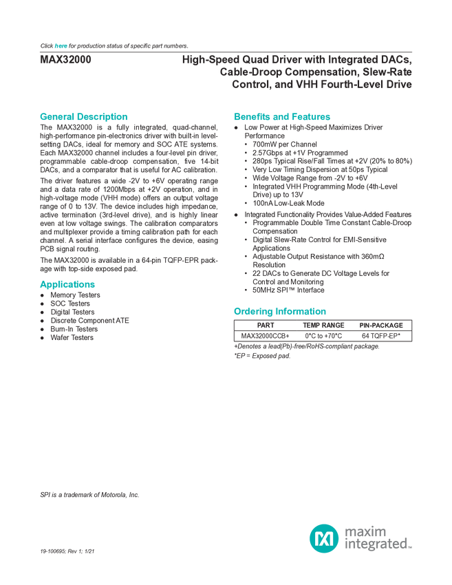 MAX32000 High-Speed Quad Driver with Integrated DACs, Cable-Droop Compensation, Slew...