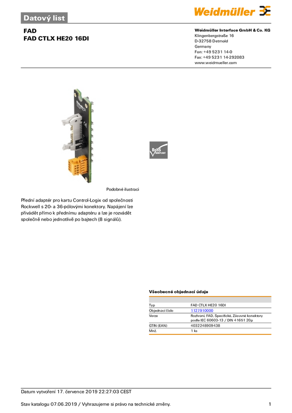 1127910000 Adapter przedni Weidmüller FAD CTLX HE20 16DI 1127910000, 1 szt.
