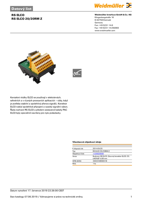 moduł interfejsu RS ELCO 20/20RM Z Weidmüller Zawartość: 1 szt.