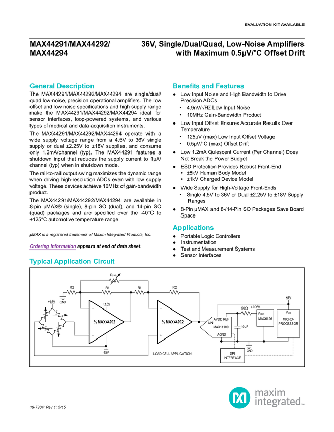 MAX44291 36V, Single/Dual/Quad, Low-Noise Amplifiers with Maximum 0.5μV/°C Offset Dr...