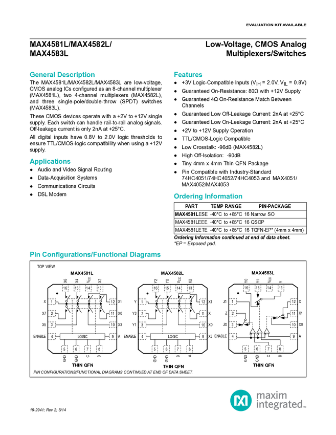 MAX4582L Low-Voltage, CMOS Analog Multiplexers/Switches