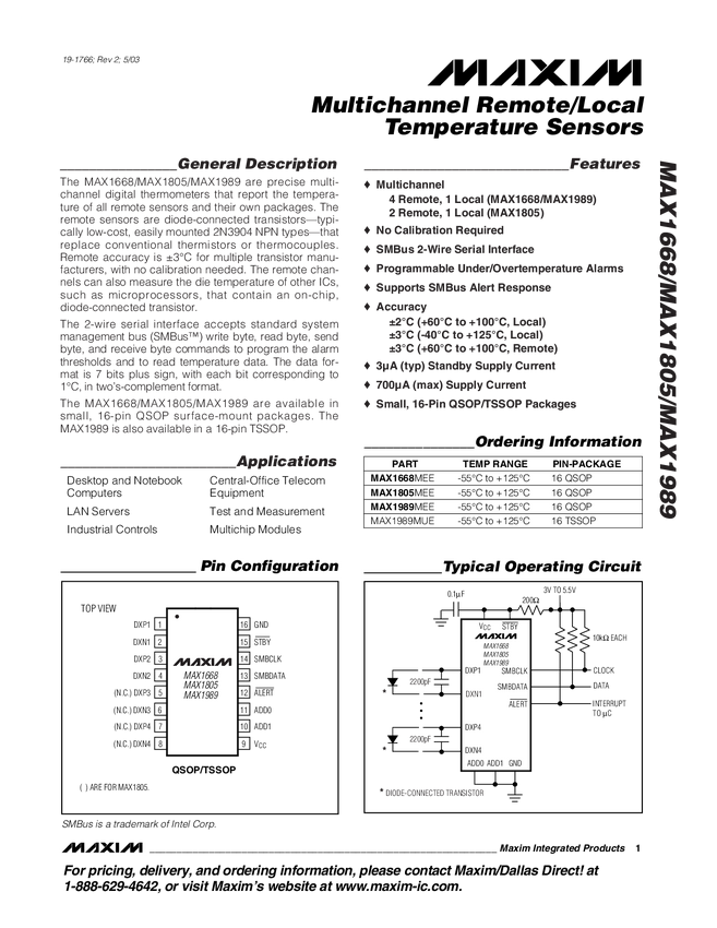 MAX1668 Multichannel Remote/Local Temperature Sensors
