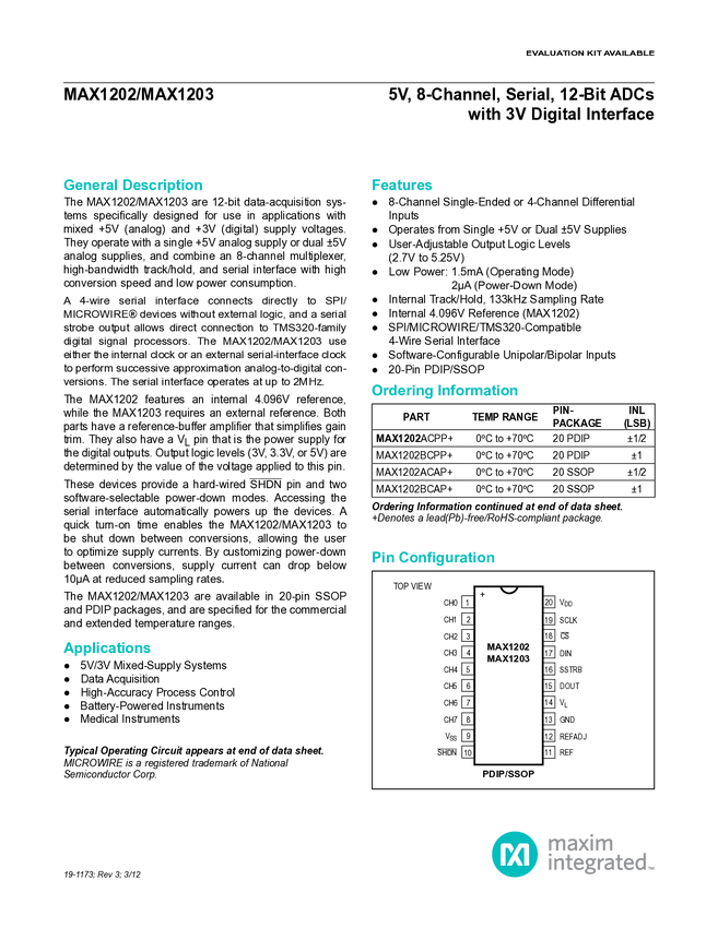 MAX1202 5V, 8-Channel, Serial, 12-Bit ADCs with 3V Digital Interface