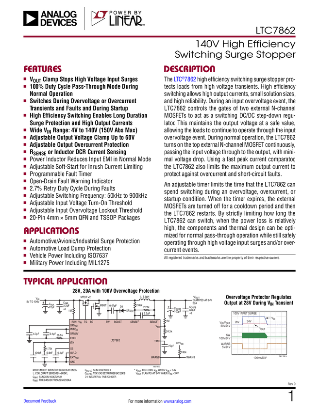 LTC7862 140V High Efficiency Switching Surge Stopper
