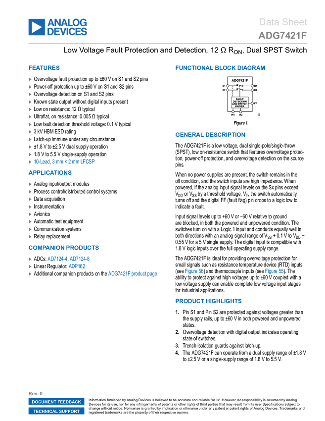 ADG7421F Low Voltage Fault Protection and Detection, 12 Ω R, Dual SPST Switch