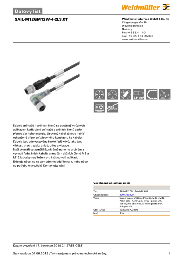 1004310300 Przewód połączeniowy Weidmüller SAIL-M12GM12W-4-2L3.0T 1004310300 1 szt.