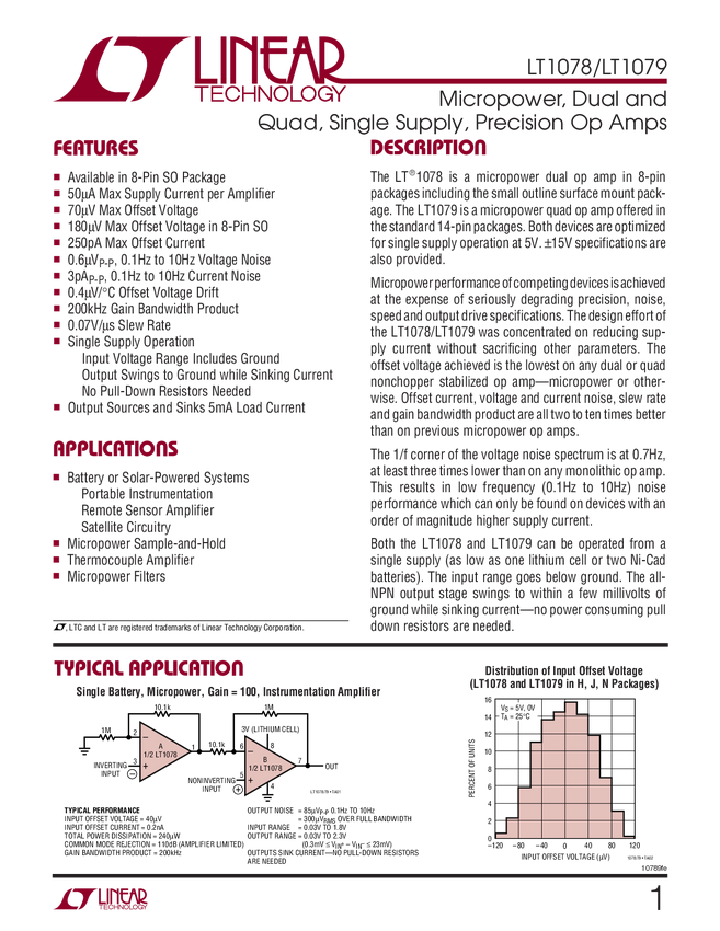 LT1078 Micropower, Dual and Quad, Single Supply, Precision Op Amps