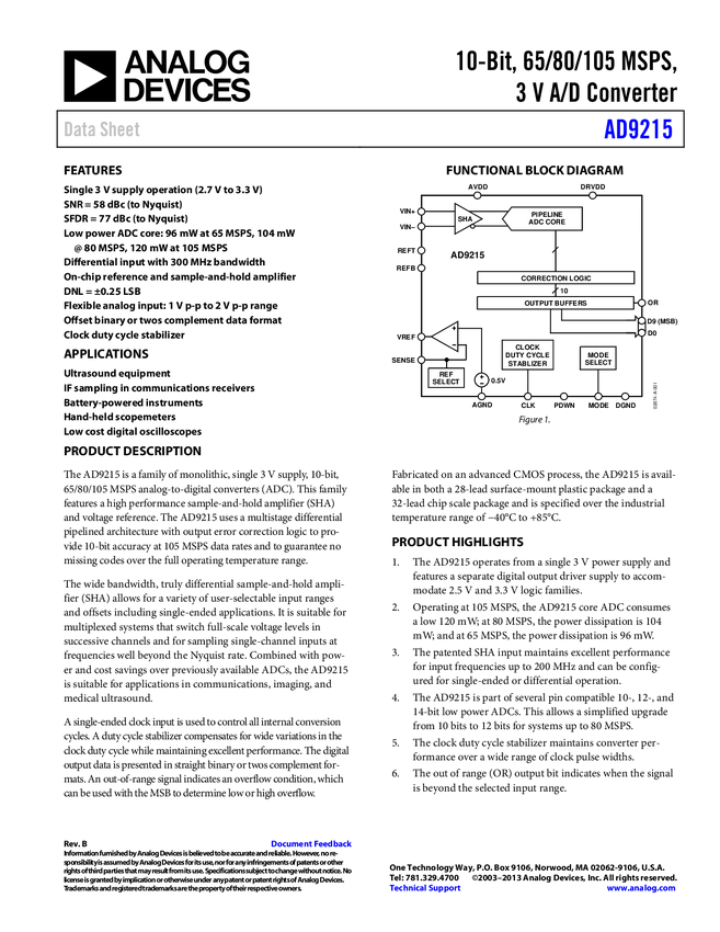 AD9215 10-Bit, 65/80/105 MSPS 3 V A/D Converter