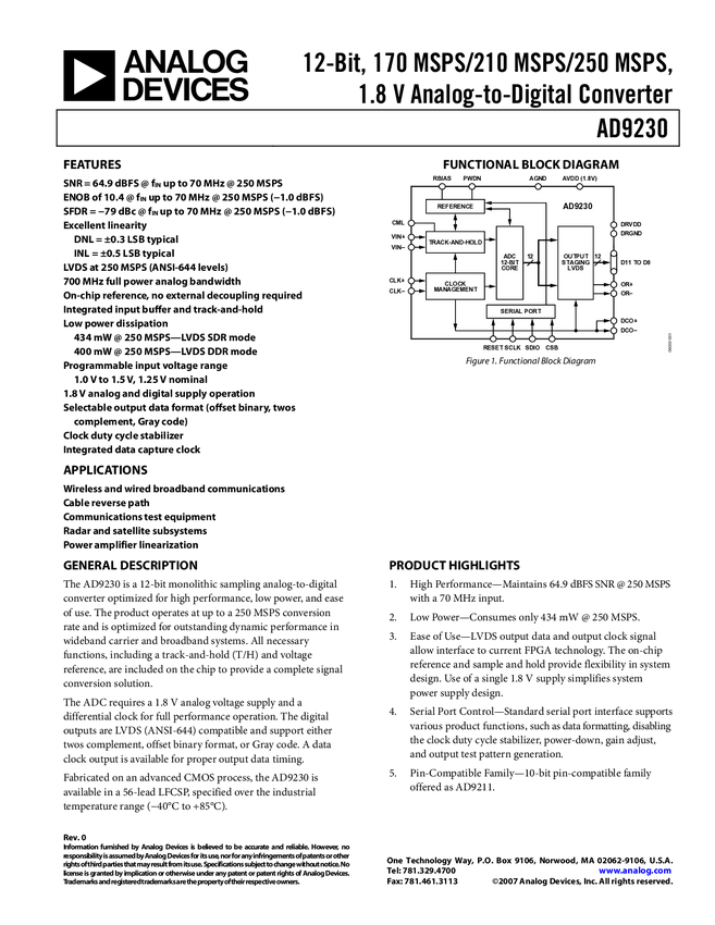 AD9230 12-Bit, 170 MSPS/210 MSPS/250 MSPS, 1.8 V Analog-to-Digital Converter