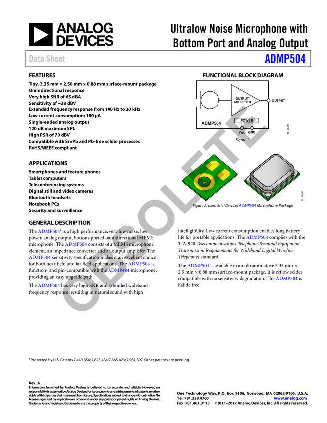 ADMP504 UltraLow Noise Microphone with Bottom Port and Analog Output