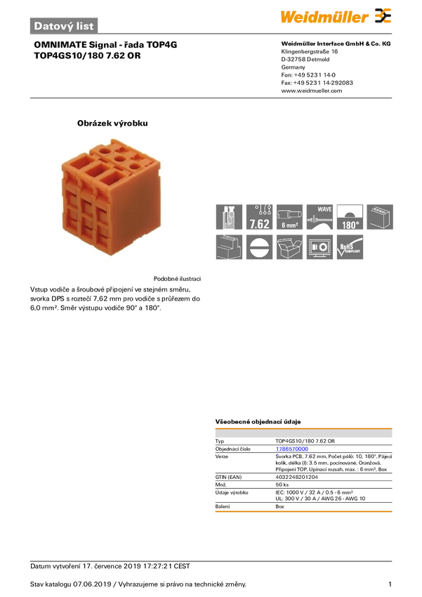 1786570000 Weidmüller 1786570000 Zaciski śrubowe 4 mm² Ilość styków 10 pomarańczowy 50...