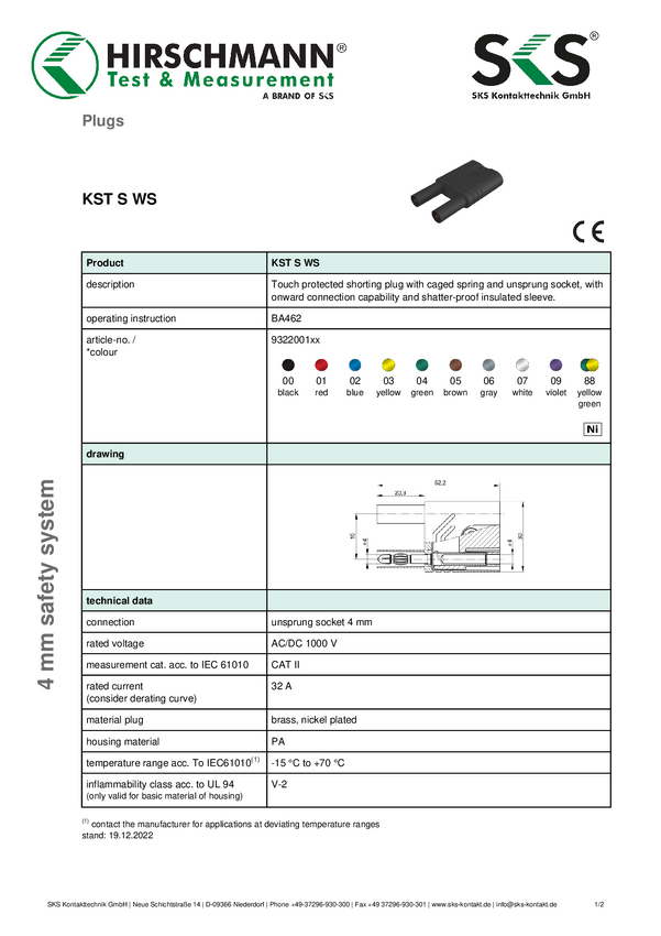 932200100 Złącze męskie zwierające, bezpieczne SKS Hirschmann KST S WS sw 932200100 Ś...