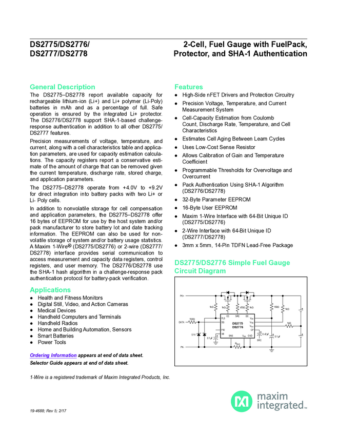 DS2778 2-Cell, Fuel Gauge with FuelPack, Protector, and SHA-1 Authentication