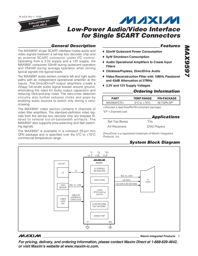 MAX9597 Low-Power Audio/Video Interface for Single SCART Connectors