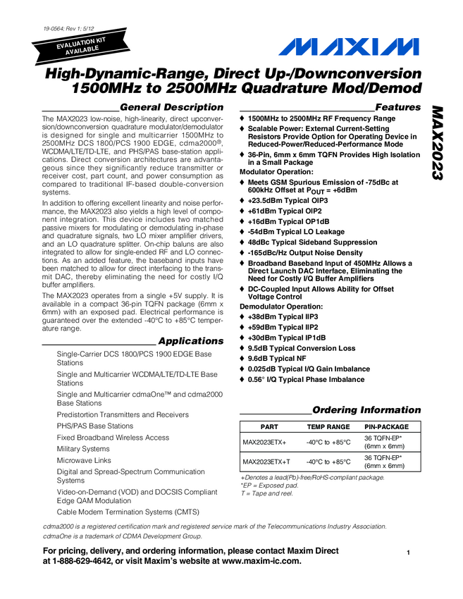 MAX2023 High-Dynamic-Range, Direct Up-/Downconversion 1500MHz to 2500MHz Quadrature...