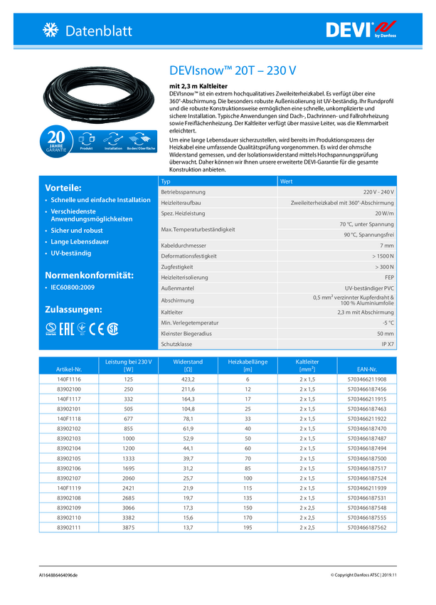 140F0657 Kabel grzewczy Danfoss DEVIsnow 30 400V 170 140F0657, 400 V, 170 m
