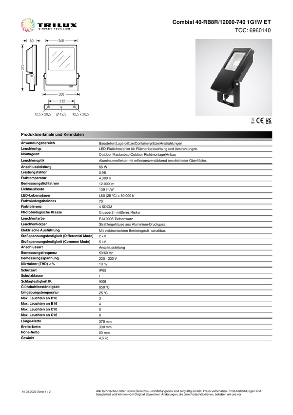 6960140 Reflektor LED Trilux Combi40-RB8R#6960140 6960140 110 W 12000 lm IP65