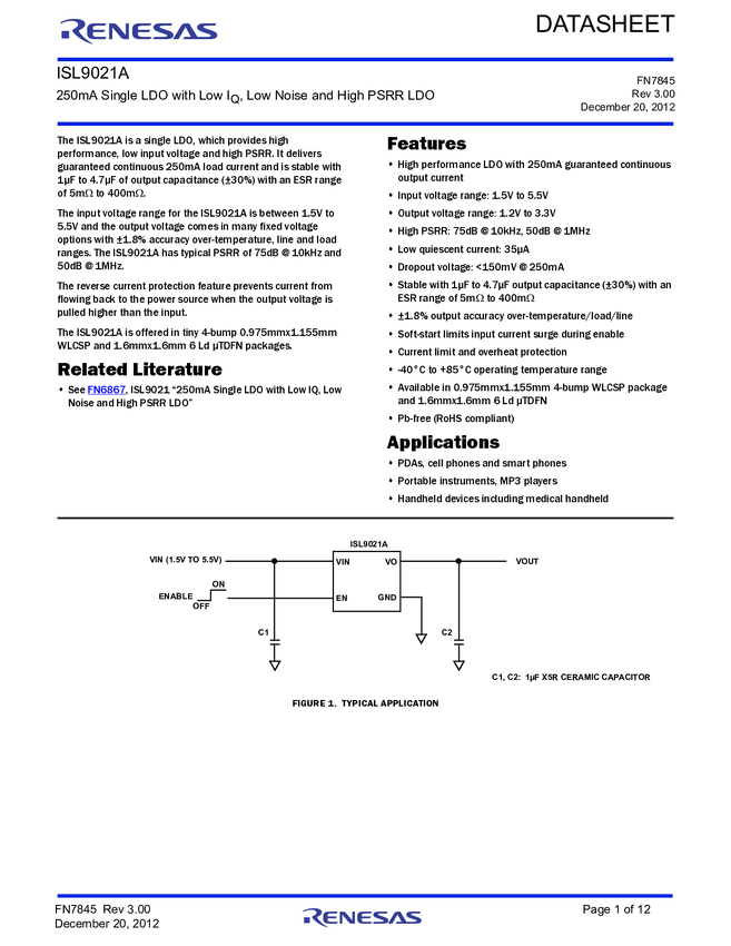 ISL9021A 250mA Single LDO with Low IQ, Low Noise and High PSRR LDO