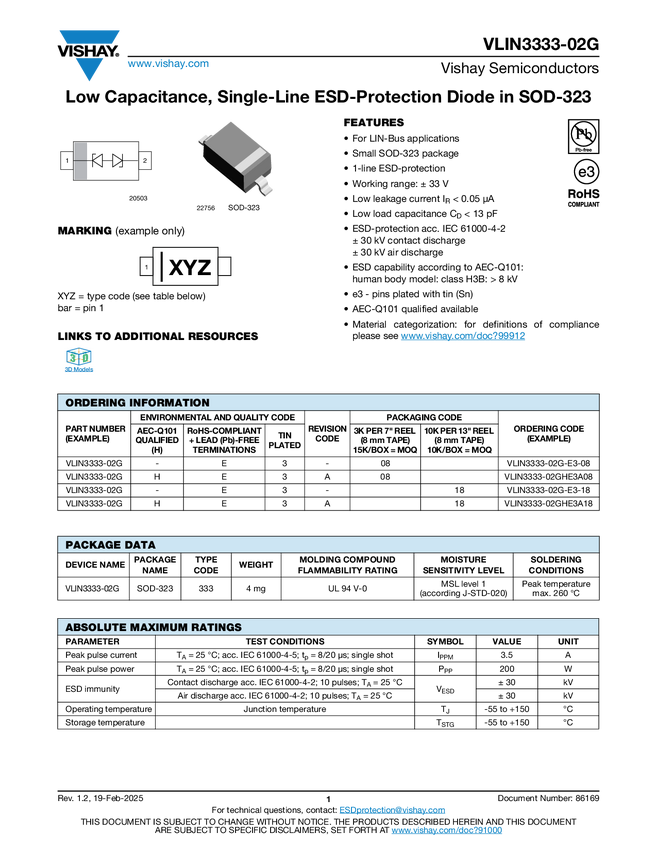 VLIN3333-02G Low Capacitance, Single-Line ESD-Protection Diode in SOD-323
