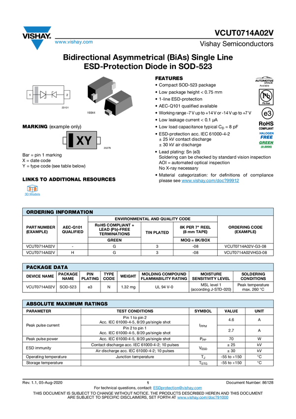 VCUT0714A02V Bidirectional Asymmetrical (BiAs) Single Line ESD-Protection Diode in SOD-5...