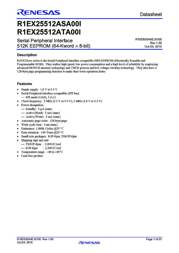 R1EX25512ASA00I#S0, R1EX25512ATA00I#S0, R1EX25512ATA00I#U0