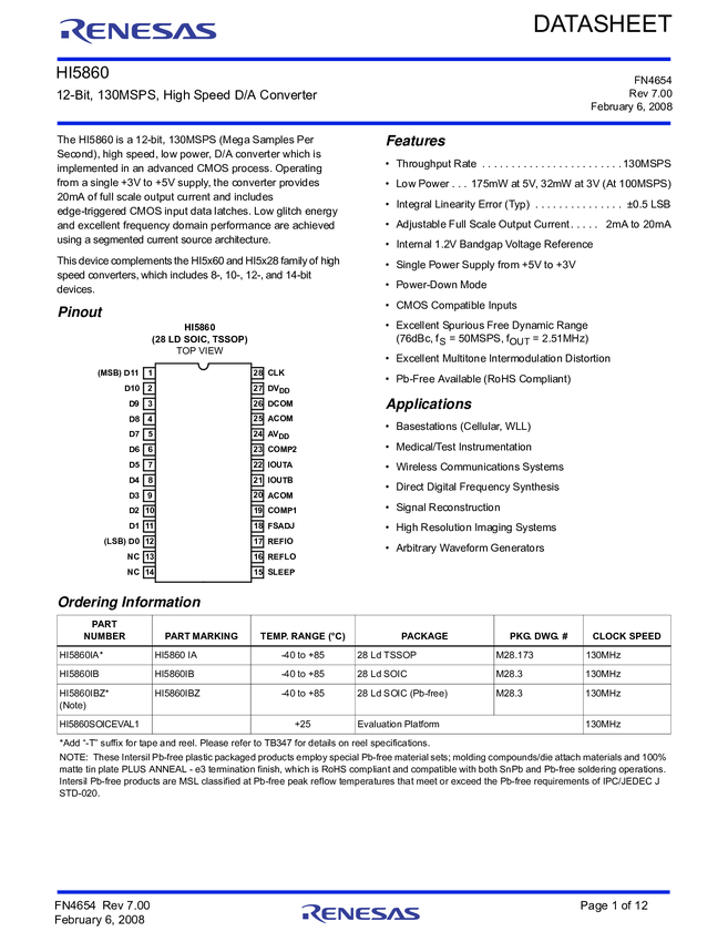 HI5860 12-Bit, 130 MSPS, High Speed D/A Converter