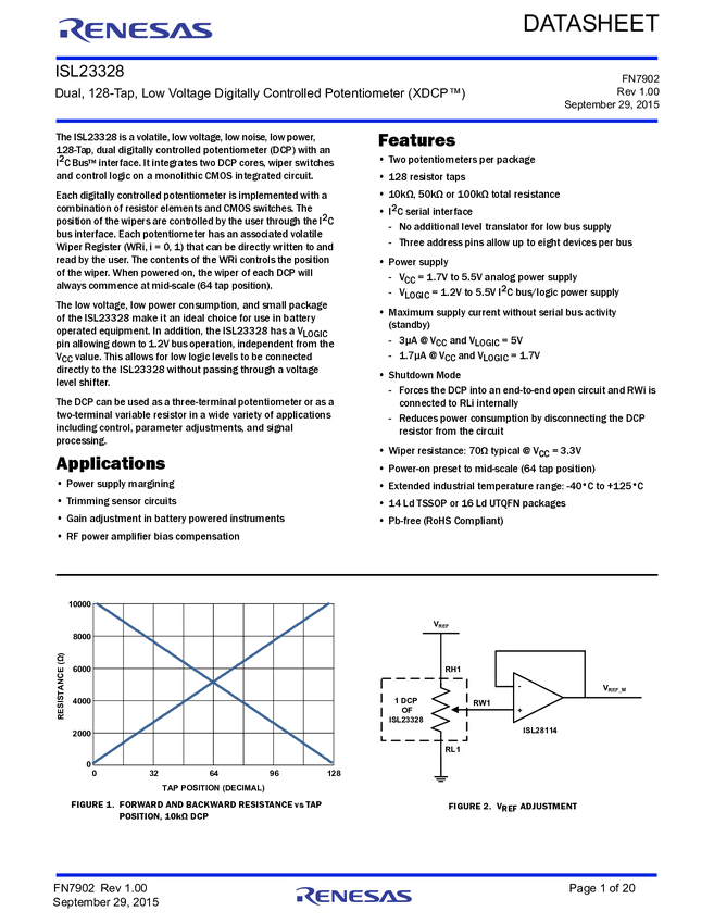 ISL23328 Dual, 128-Tap, Low Voltage Digitally Controlled Potentiometer (XDCP™)