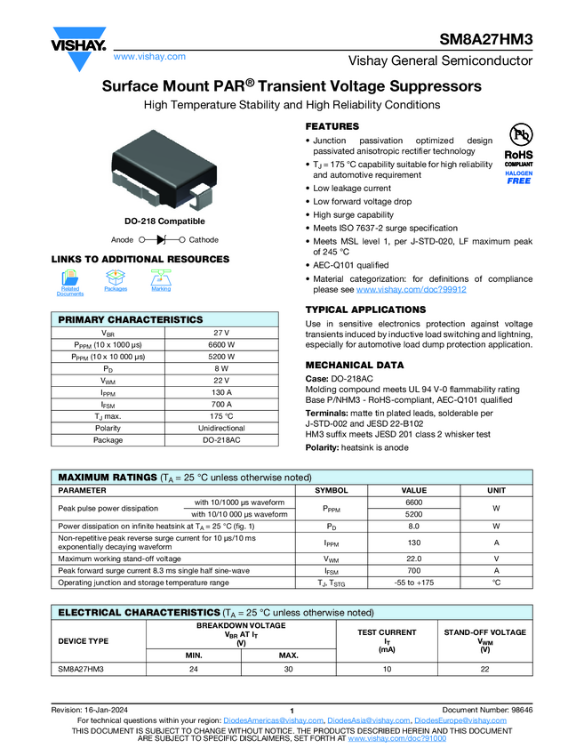 SM8A27HM3 Surface Mount PAR® Transient Voltage Suppressors High Temperature Stab...