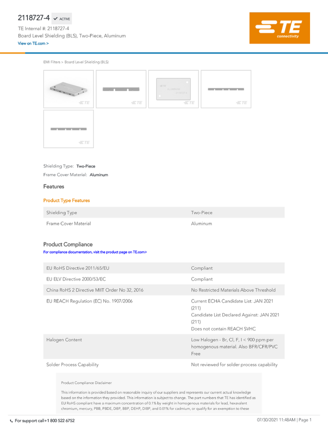 2118727-4 TE Connectivity TE AMP Board Level Shielding 2118727-4, 1 szt.