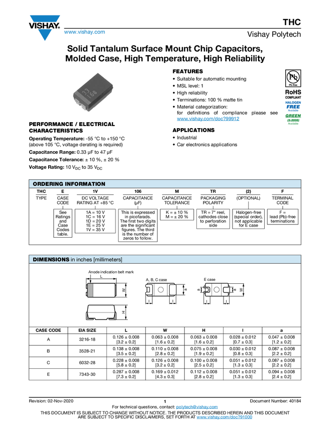 THC Solid Tantalum Surface Mount Chip Capacitors, Molded Case, High Temperature...