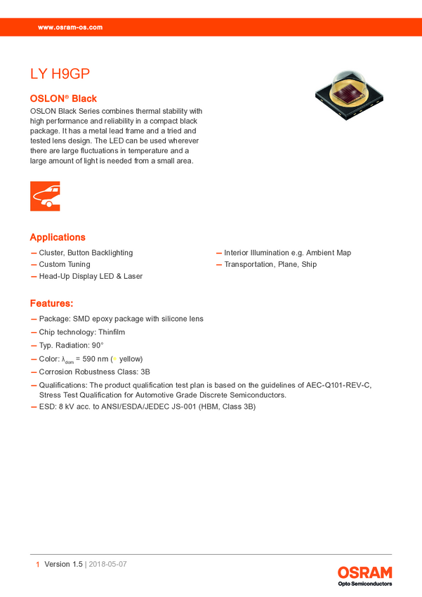 Dioda LED; LY H9GP-HZKX-36; SMD; OSLON; żółty; 2,05-2,65V; 21-38cd; 3,95x3,95x2,41mm; 90*; OSRAM; RoHS; opakowanie/100szt