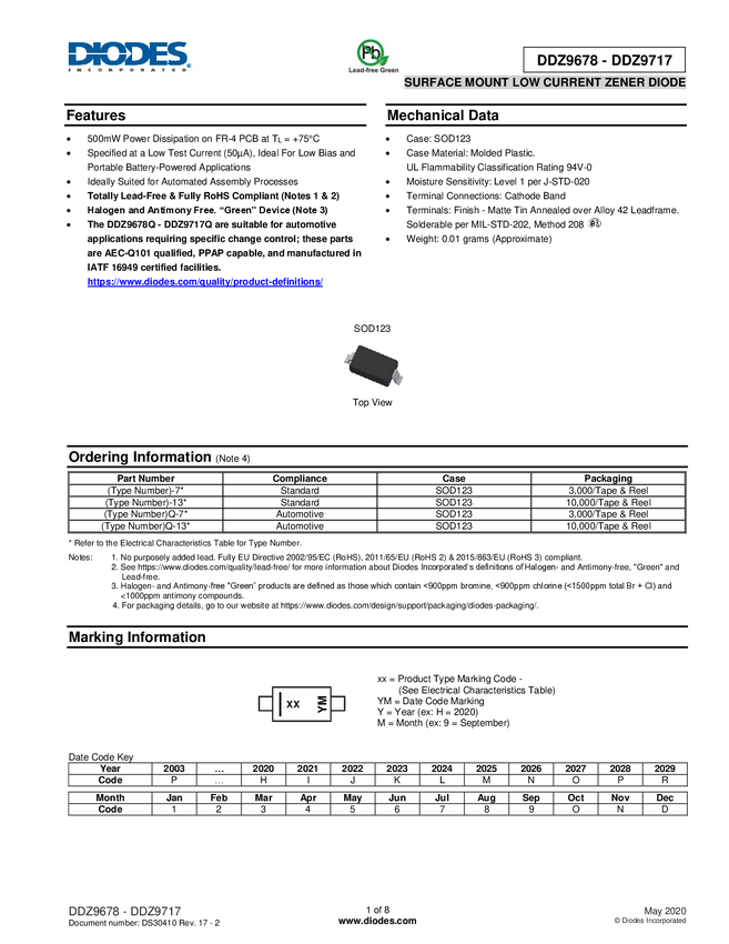 DDZ9678-7 Dioda; Zenera; DDZ9678-7; 0,5W; 1,8V; SOD123; SMD; DIODES; RoHS; op/100szt