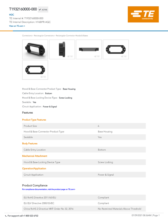 T1932160000-000 TE Connectivity T1932160000-000 TE AMP HEAVY DUTY RECT SIBAS, 1 szt.