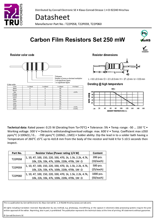 Zestaw rezystorów węglowych TRU COMPONENTS TC-12888460 T22P058 osiowy THD 0.25 W 5 % 200 szt.