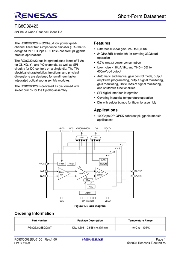 RG8G32423 4 x 32Gbaud Quad-Channel Linear Transimpedance Amplifier