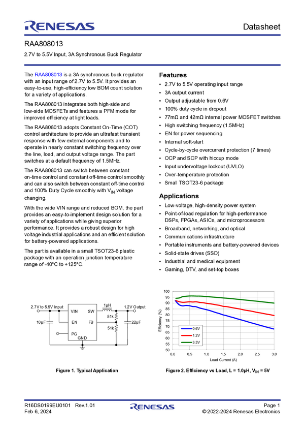 RAA808013 5.5V 3A Compact Single-Channel DC/DC Synchronous Buck Regulator